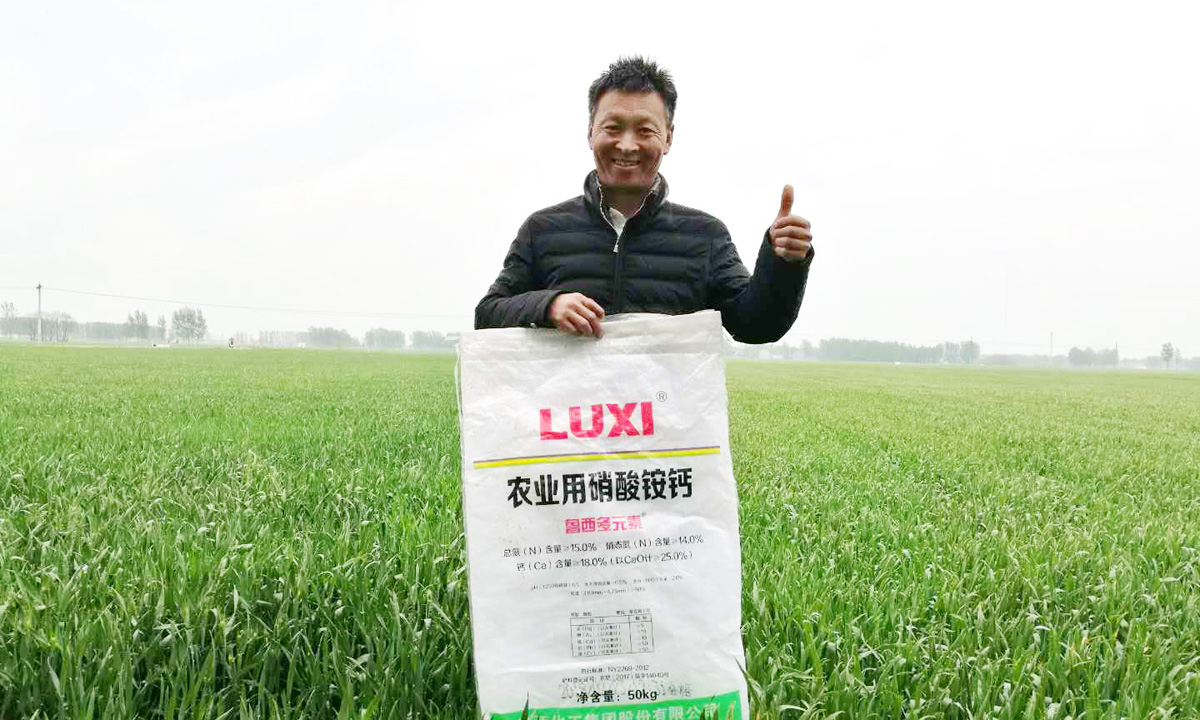 魯西集團在去年引進了先進設備,生產出高品質小麥追施肥--硝酸銨鈣。該產品在改變傳統氮元素存在形態下,添加了作物生長必須的第四大元素--鈣。硝態氮肥效快,使用當天就見效;鈣元素的補充,又使農作物的品質得到改良,更利于作物對鉀元素的吸收,促進細胞分裂,增強對環境脅迫的抗逆能力,防止作物早衰,還能抑制真菌侵襲、降低病害的感染程度,從而起到改善作物品質的作用。